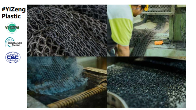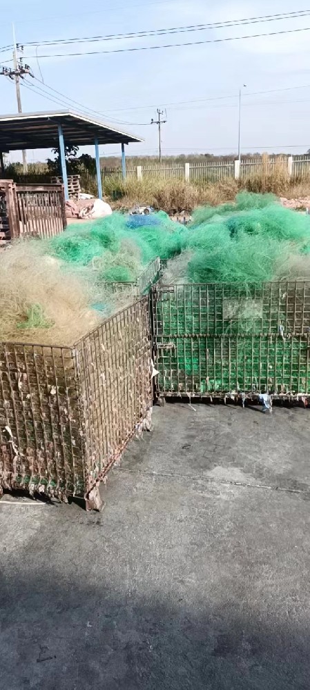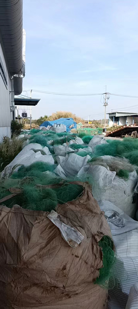 The waste raw materials we recycle include PA (Polyamide, Nylon, polyamide) PP (Polypropylene, polyene). Waste fishing nets collected from salvage are classified, dried, washed, crushed, washed again, dried and finally processed into recycled raw materials made of 100% waste fish nets.